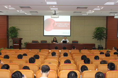 为更好的推进2016届毕业生就业工作,2013年9月22日下午三点整,电气学院在校图书馆B101召开了2016届毕业生就业动员大会,电气学院党总支书记徐兵老师、党总支副书记、副院长胡婷老师、毕业班辅导员王晨义老师和200多名毕业生出席了此次动员大会。